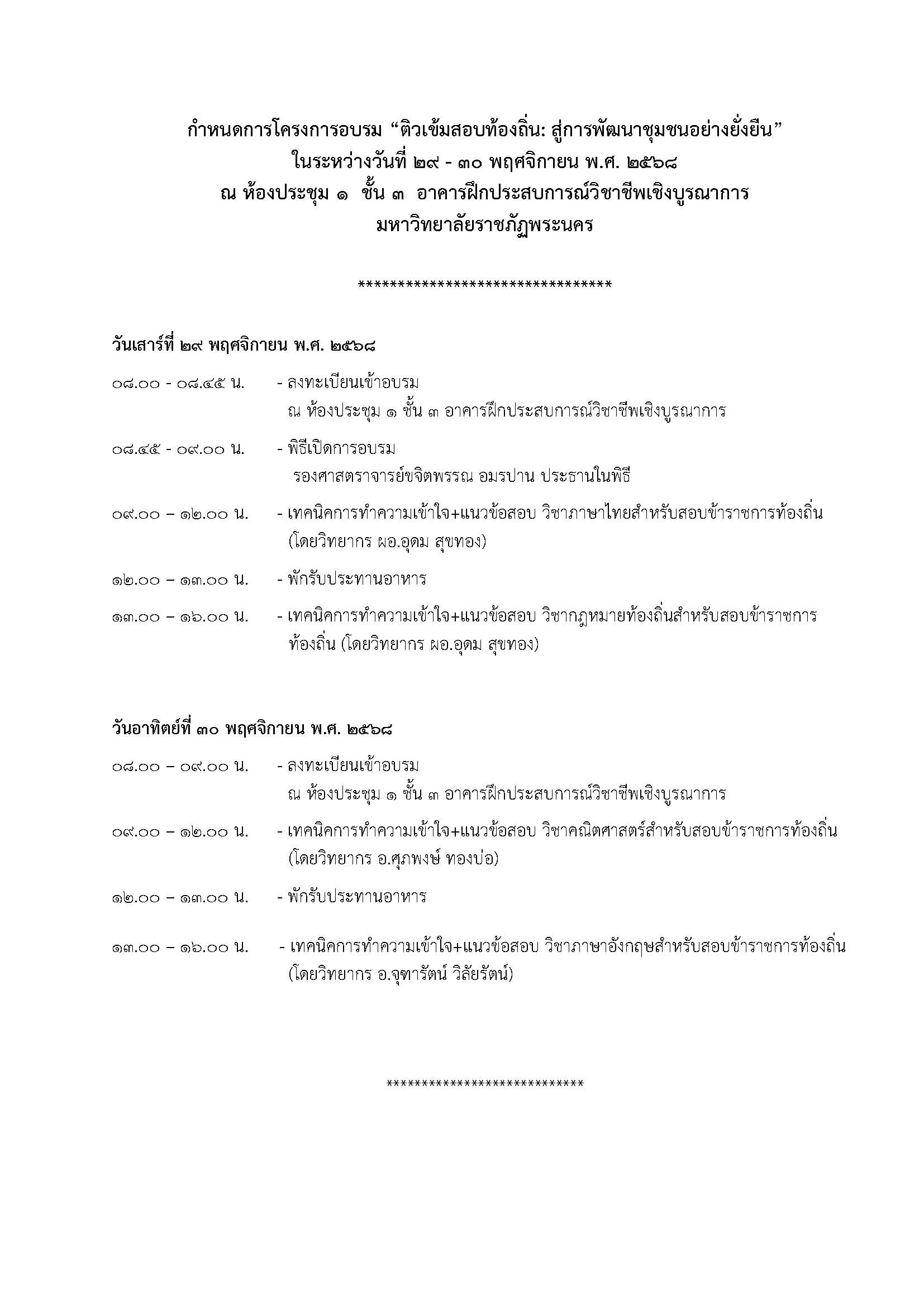 กำหนดการโครงการอบรม "ติวเข้มสอบท้องถิ่น : สู่การพัฒนาชุมชนอย่างยั่งยืน"